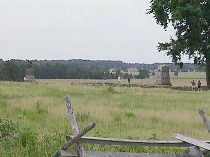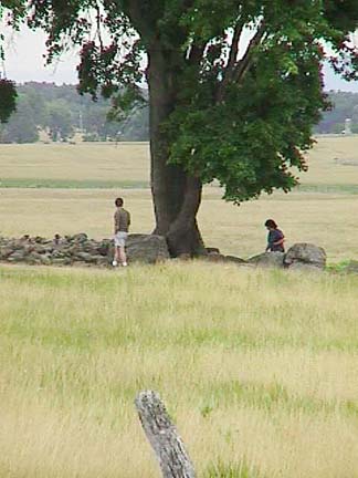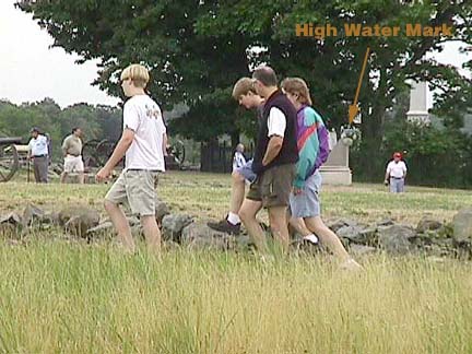 While many accounts of Pickett's Charge emphasize that the Union had the high ground and was protected by stone walls, neither the slope nor the walls are that impressive. Here, the wall is shown as knee high. The wall shown is from The Angle. The people shown are walking towards the Union rear. In the background is the High Water Mark tablet.