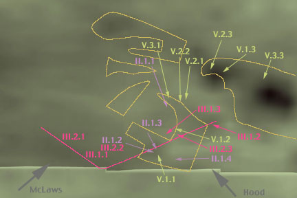 While McLaws' and Hood's Confederate divisions are shown coming in from the bottom of the above picture, the prime intent is to show the positions of the memorials dedicated to Union brigades. The notation used is Corps.Division.Brigade. For example V.1.3, is V Corps, 1st Division, 3rd Brigade. This is Colonel Vincent's brigade, on top of Little Round Top. II Corps is in violet, III corps hot pink, and V Corps in yellow. The forests are again outlined in gold. The attacking confederates are shown in gray.
