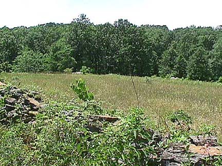 Would you give up Little Round top to defend this position? Behind Devil's Den is a dropping slope, and a clearing. This is Sickles' left flank in his advanced position. It is not a bad position. As we move on, we will find that both the Wheat Field and the Peach Orchard are along the same ridge. Here we have a stone wall, the high ground, and a clearing sans cover the opposition has to cross. What more could one want? (Little Round Top? The Valley of Death? What, are you greedy?)