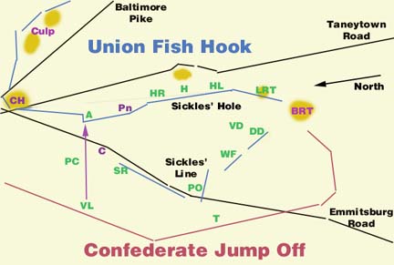 The above will not be the most accurate map you will find of the Gettysburg field, but as viewed from the Virginia monument (VL), the Round Tops (LRT & BRT) are behind the Peach Orchard hill (PO).