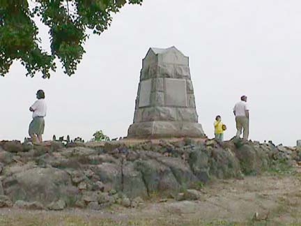 1. In 1863, the natives were more aggressive. Note, the wall isn't even knee high to the adults on the far side, but it might be waist high from this side. The ridge takes an abrupt step up at the wall. The larger boulders are natural, and rise to the height of the ground beyond. The smaller rocks behind are man built wall.
