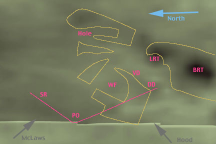 Looking up the "shank" of the "fishhook" from Little Round Top to Cemetery Hill. P Peach Orchard, W General Warren statue, H Sickles' Hole, A The Angle, Pn, Pennsylvania Monument, C Cemetery Hill and the Cyclorama building.