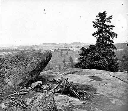 The black and white photo is period, taken days after the battle. It was downloaded from the Library of Congress, digital ID is "cwp 4a39687." Note the trees just west of the Union Line were fewer at the battle. The field of fire, the kill zone in front of Sickles' hole was greater at the time of battle than is shown in the modern color photos. The modern photo was taken from atop a New York monument, a small castle. The old picture was taken from significantly lower ground. Still, some of the same rocks appear in both photos.