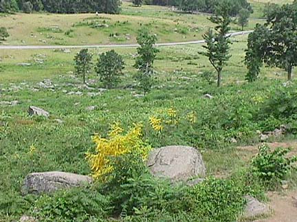 Panning right, the slopes of Little Round top again, and the Valley of Death above. The point of these pictures is that Round Top is the most defendable point on Sickles' front. It has a stronger slope and better cover than the forward position he assumed. It's field of fire isn't as great in his front than the Peach Orchard, but exceeds the Wheatfield, and the back of Devil's Den.