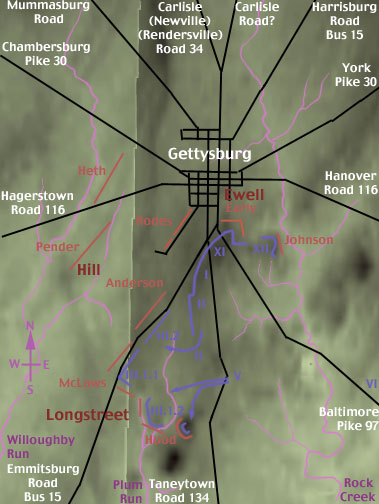 On the other hand, it could be argued that the fighting was not truly close. Elements of the XII Corps had been moved from the Culp's Hill and Spangler's Spring area to possibly reinforce Sickles. They did not engage. They were not needed. The II and V Corps were sufficient to cover Sickles' retreat. Note also the head of the VI Corps column at the edge of the map on the Baltimore Pike. They were late, marching hard to recover from their excursion east to cover Early's and Stuart's presence near York.. However, had a few close fights gone the Confederate's way, while they might have taken and held Cemetery Ridge, they would not have had the force to roll up Cemetery Hill and Little Round Top. At some point, Longstreet's exausted and battered Corps would have had to deal with a fresh VI Corps.