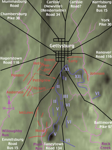 July 3rd: Pickett's and Pettigrew's Divisions, and parts of Pender's, Heth's and Anderson's make the charge. Part of Anderson's Division detaches, making almost a separate attack. Note the VI Corps, the only fresh Union unit, was used to patch weak points and protect flanks, but was kept to the south and rear area, able to reassemble moderately quickly. None of these anticipated weak points were hit. |