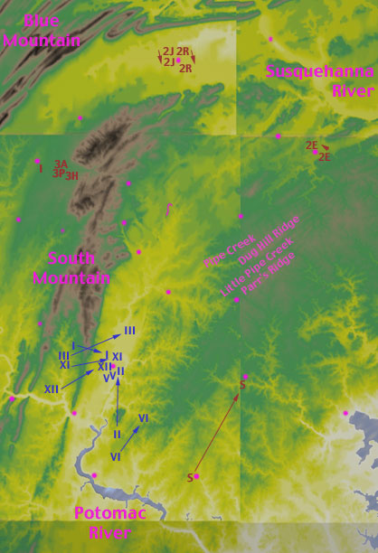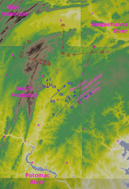 The following maps are based on USGS data and Map 2 from Edwin Coddington's The Gettysburg Campaign, A Study in Command. The blue roman numerals represent the seven Corps of the Army of the Potomac. Longsteet's First Corps barely moved during the four day period of June 28 through July 1. It is shown as a single red 1. The southern II and III corps are shown in red at the division level, with a letter designating the division commanding general following the corps number. I switched from roman to Arabic numerals for southern units, as they are often very close together, and the arabic numbers allow tighter readable spacing. Stuart's cavalry is shown with a red S. Most towns are shown as dots. Gettysburg is marked with the fish hook of the July 2 and July 3 battle line. The names of the towns can be found on a similar map on the Meade's Strategy page.