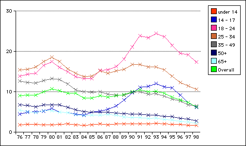Stepping further back, it becomes even clearer that the problem of the early 90s was an adult problem, not a children's problem. While the teens did share the early 90s peak, the 18 - 24 age group showed it even stronger, with the 25 - 34 group reflecting it as well. Focusing on the young adults, not on the children, seems prudent.