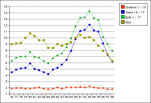 There has been no sudden child homicide emergency. The true children, plotted in red, age 13 and under, have had a remarkably flat curve. The sudden "protect our children" cry is a expedient tactic to exploit propaganda opportunities. The teen curve is moving with the adults. There was a peak in the early 1990s, likely drug related, and the teens were involved. The height of the emergency is past. The sudden concern for the children came after the crisis. Clearly, the teen problem is an adult problem. Focusing political energy into child oriented precautions isn't the solution there.