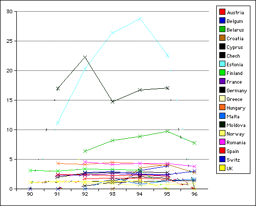 However, the former Soviet countries, Estonia, Belarus and Moldova, are not representative of the rest of Europe. All other countries stay nicely in the 0.5 to 5 range. The former Soviets are in the 7 to 28 range. Without the former Soviets, the average increase is 0.06, which gets lost in the noise. Excluding the Soviets, only 7 of 19 countries have an increasing homicide rate. The difference between the former Soviet countries and the rest of Europe is not likely best attributed to violent movies and video games. Especially during this time frame, social and economic unrest seems the more likely cause.