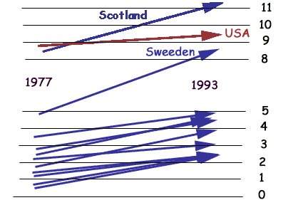 The arrows represent the US, Scotland, Sweden, Hungary, France, India, Australia, Denmark, Belgium, New Zealand, England / Wales, Greece, Norway and Spain. Most of the arrows are too close together for labeling. However, let's compare Grossman's Interpol numbers to the UN report used by myself and Gunfree. Note, Grossman provides a copyrighted chart with no absolute numbers. My reading values off his chart may not be totally accurate, but should be within two tenths. The UN numbers are a few years later. My number for the USA is a full five years later. Still...