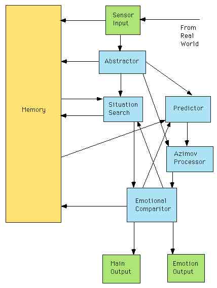 Finally, the output of the Asimov processor was sent to emotion display. In this case, neither memory search nor extrapolator proposed courses of action that could definitely prevent all possible loss of life, resulting in voice and facial displays corresponding to anxiety and fear. This can clearly be heard in the following recording, where the Joy Class unit implements her solution to this rather interesting problem...